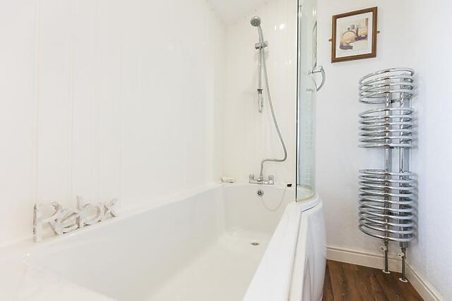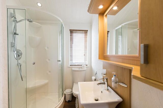 The well-equipped family bathroom features a shower over a 'P' shaped bath and WC, providing flexibility for all guests. The enclosed decked terrace creates a wonderful outdoor space to enjoy the rolling valley views, complete with dining furniture for quiet morning brews and al fresco evening meals.