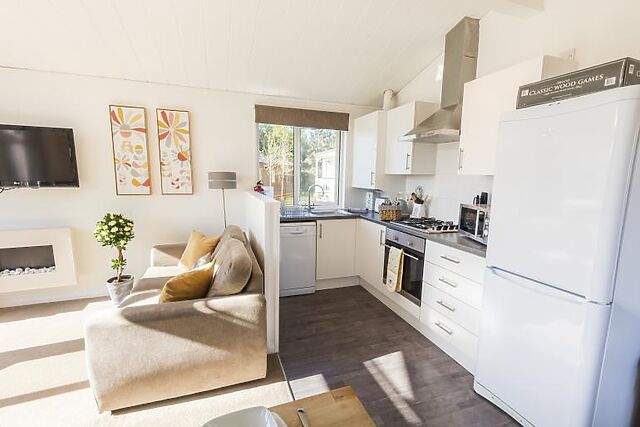 Beneath the cabin-style exterior, you’ll find a haven of charm in the spacious open-plan lounge/kitchen/diner at the heart of this home-from-home. The contemporary neutral colour palette perfectly complements the countryside views whilst the cosy electric fire sets a truly warming ambience that beckons tired travellers to unwind and dine with loved ones.