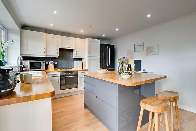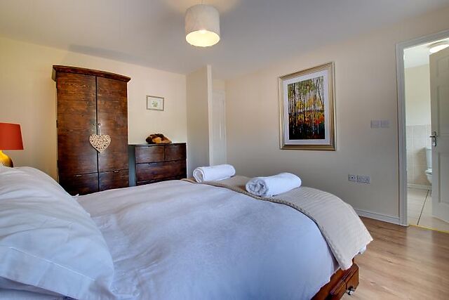 The space wraps around to a well-equipped kitchen, complete with everything you may need to cater as well as a breakfast bar island with high stools. Upstairs, you’re met with a large king-size bedroom featuring a delightful en-suite shower room, plus another equally as wonderful king-size bedroom.