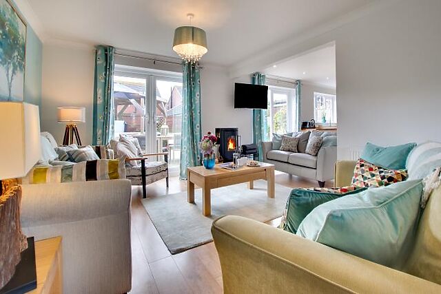 The rest of the ground floor comprises a generous open-plan lounge, kitchen and dining room, well-presented to a high standard. You’re greeted with a large wooden dining table and high-backed leather chairs upon entering the space, leading through to the lounge area behind, defined by plenty of comfy sofas and armchair seating nestled around a Smart TV and a cosy wood burner.