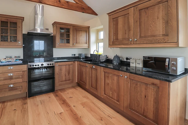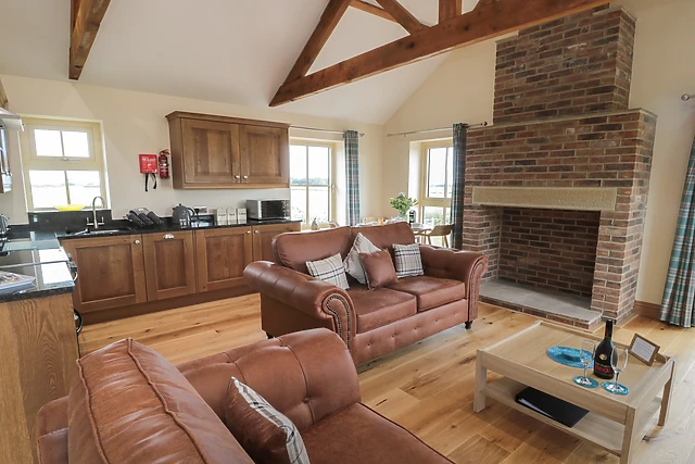 Relax in the open-plan living space, featuring a fully-equipped kitchen, dining area, and a cosy sitting space with an inglenook fireplace and Smart TV.