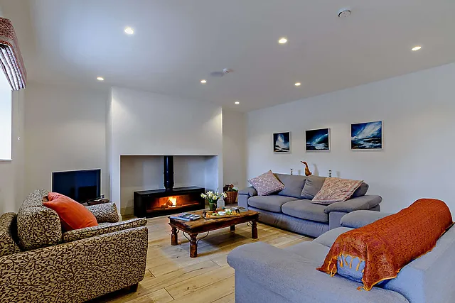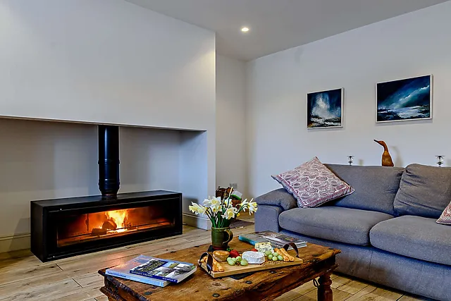 The spacious living area, complete with a wood burner, is ideal for cosy evenings, while the modern galley-style kitchen caters to all your culinary needs.