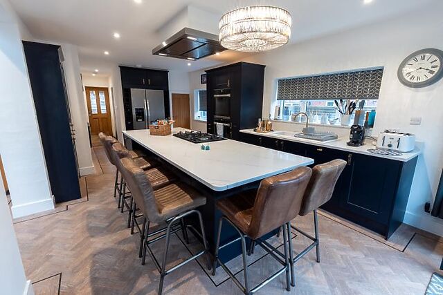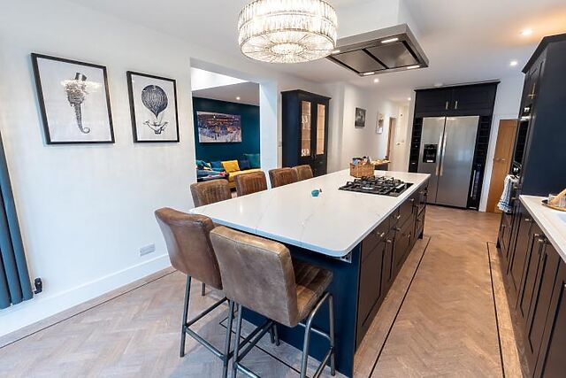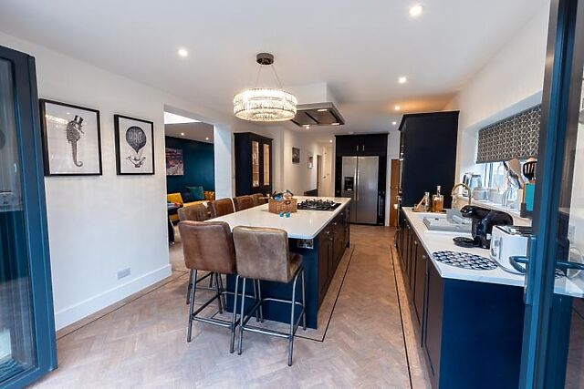 The open-plan kitchen and lounge area is perfect for family gatherings, with a breakfast bar, sleek marble surfaces, and modern amenities.