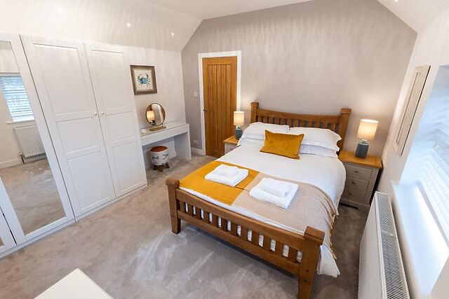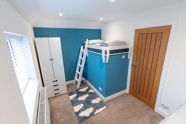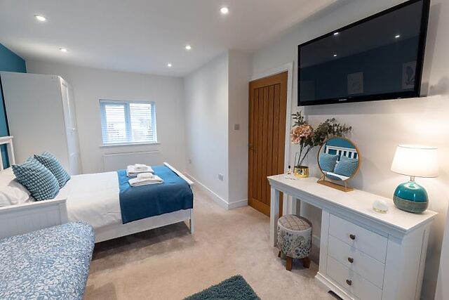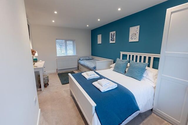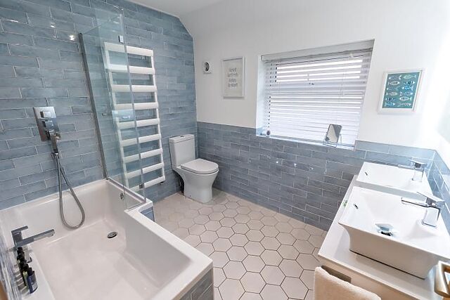 Upstairs, the family bathroom boasts a luxurious waterfall shower and double sink, ensuring comfort for all guests.