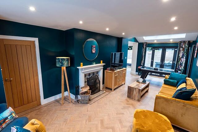 Relax in the vibrant lounge, complete with colourful furnishings, a Smart TV, an air hockey table, and a cosy wood burner.