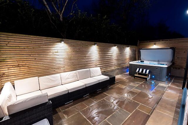 Stunning bi-fold doors lead out to the garden area, where you can unwind on the spacious garden corner sofa. The highlight is the large hot tub, perfect for soaking away your stresses.