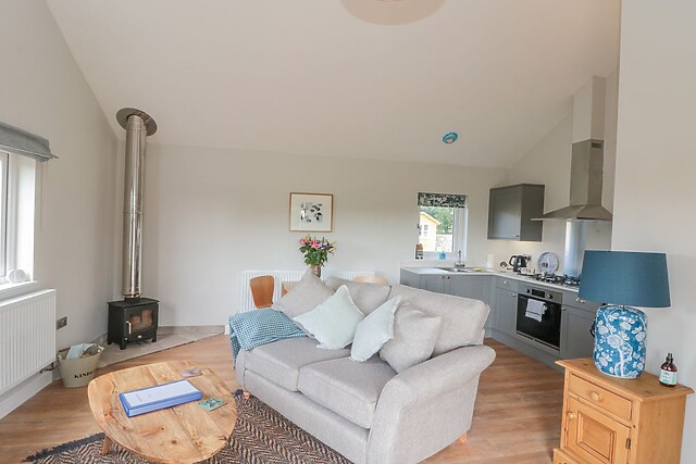 The open-plan living space, adorned with a woodburning stove, offers a warm and inviting atmosphere for relaxing evenings.