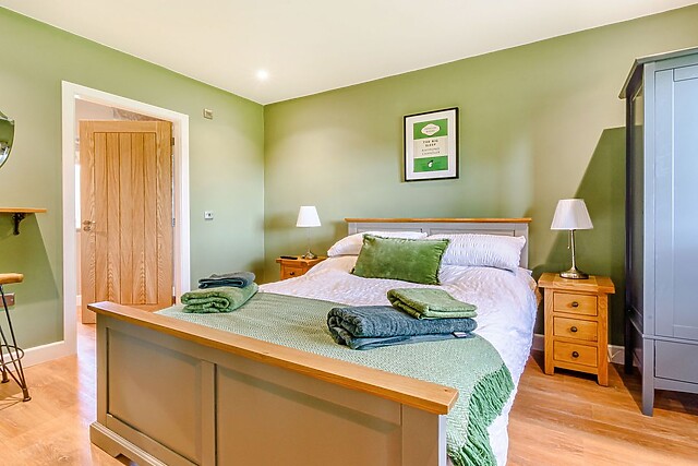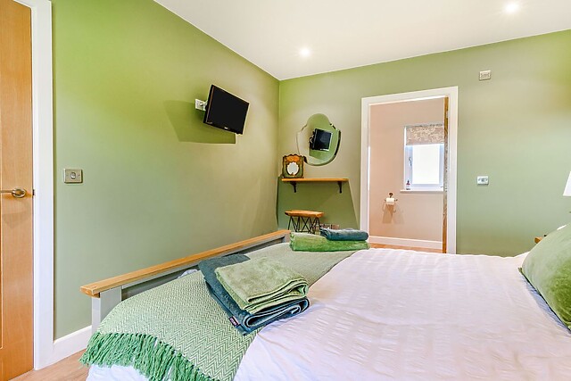 The accommodation sleeps two guests in a cosy double bedroom, complete with a Smart TV and an en-suite walk-in shower.