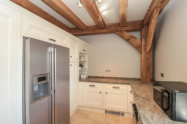 The main bathroom is a haven of relaxation, boasting a bath, walk-in shower, heated towel rail, basin, and WC. The heart of the home is the open-plan living area, equipped with a range oven, electric oven, hob, air fryer, microwave, fridge/freezer, dishwasher, washing machine, and wine chiller.