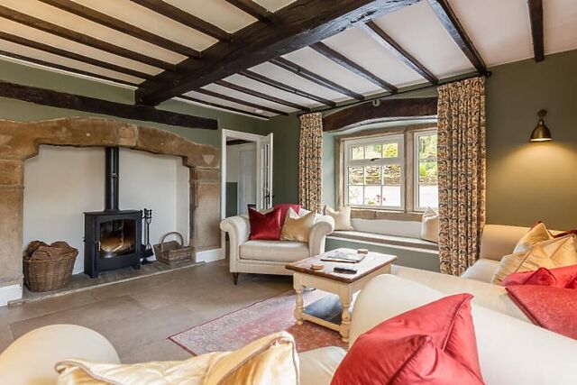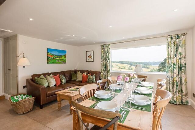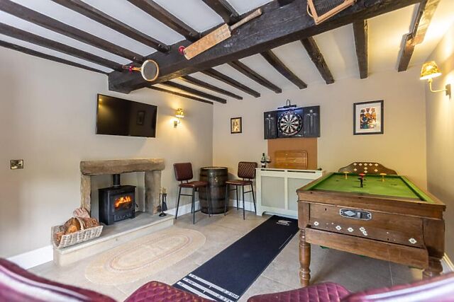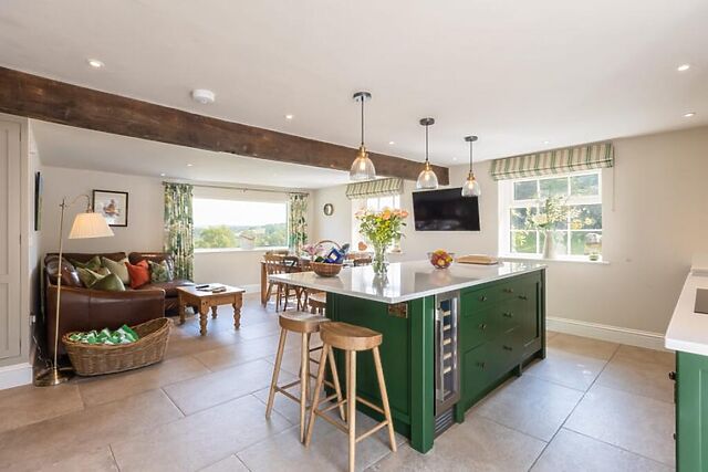 To the front of the property you will find a cosy games room with a wood burner that offers a relaxed spot for rainy days and the sitting room that features exposed beams, comfortable seating and another wood burner for cooler evenings. The heart of the home is the spacious open-plan living area, filled with natural light and framed by countryside views.