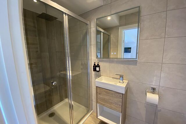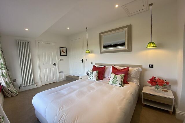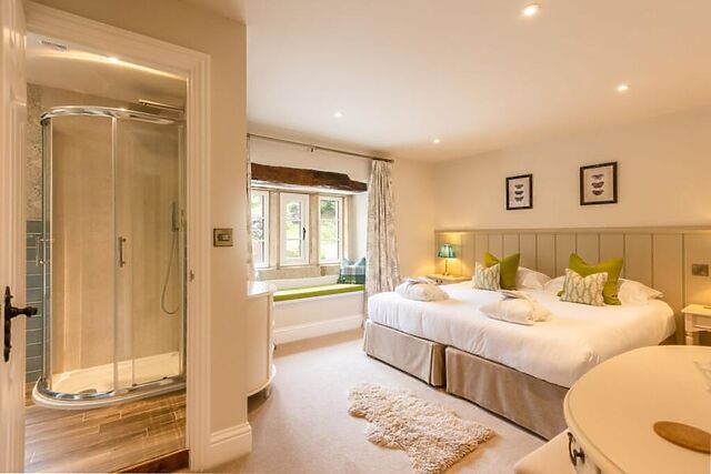 A well-equipped kitchen with a large island flows into the dining and seating areas, offering a sociable layout that blends rustic character with modern living. The ground floor also includes a double bedroom with a large window overlooking Swinsty Reservoir and an en-suite shower room.