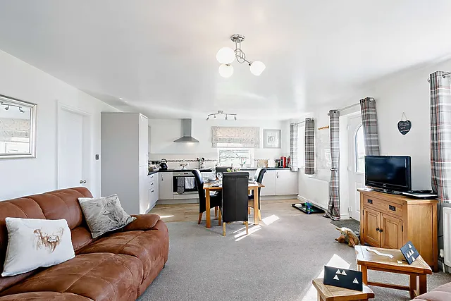 The open-plan living space, complete with comfortable sofas and a well-equipped kitchen, ensures a homely atmosphere where you can unwind or cook up a storm.