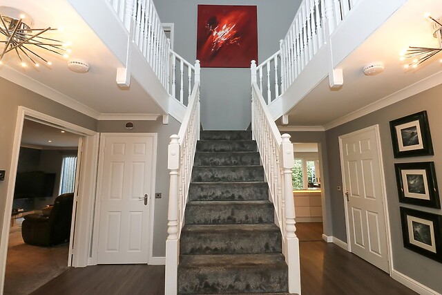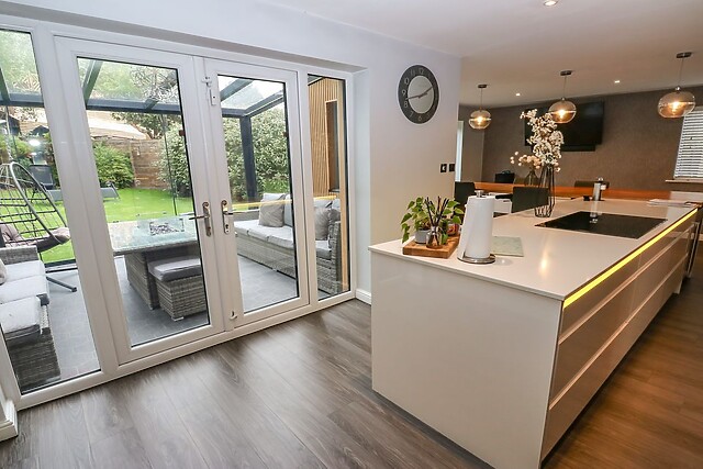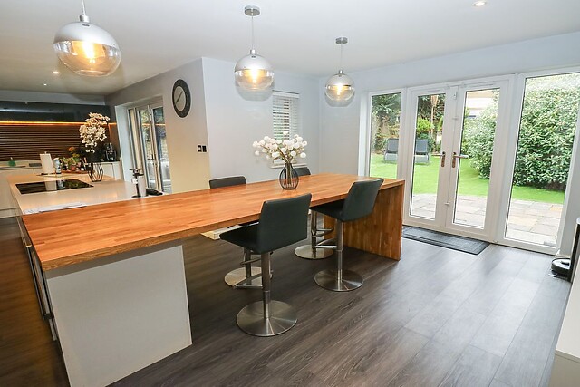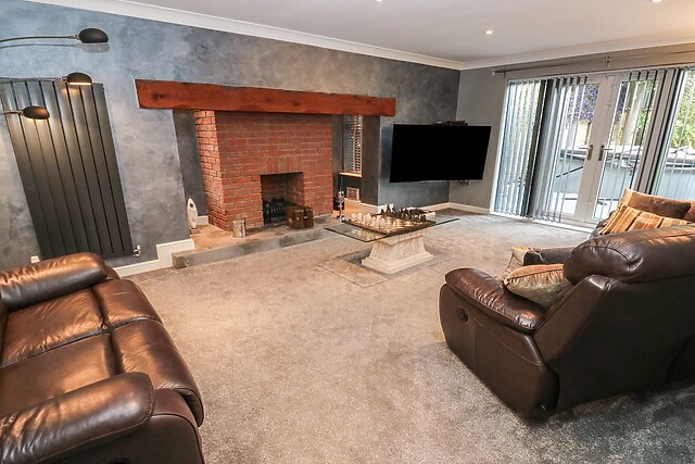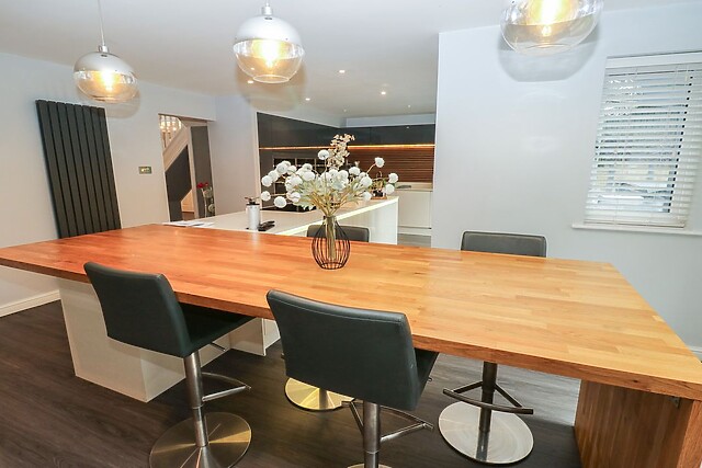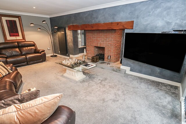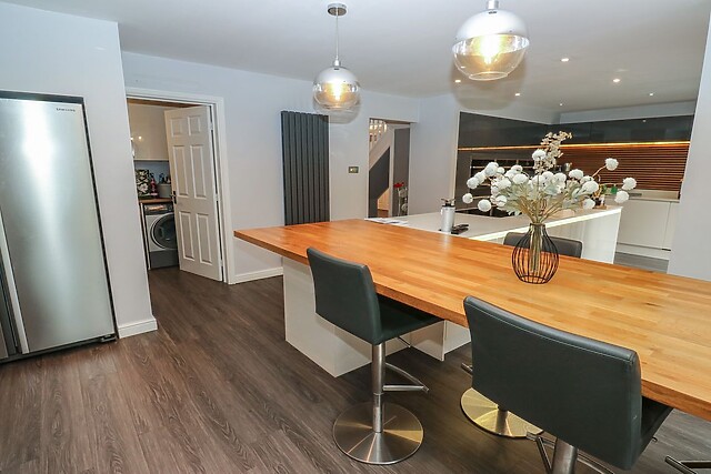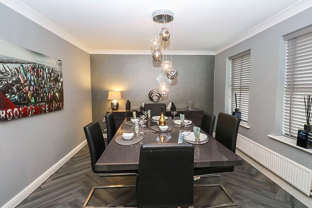 The adjoining dining room, with seating for eight, invites everyone to come together, while the separate utility room with a washing machine and tumble dryer adds extra convenience. The sitting room is made for family time, featuring two generous sofas, and a large Smart TV.