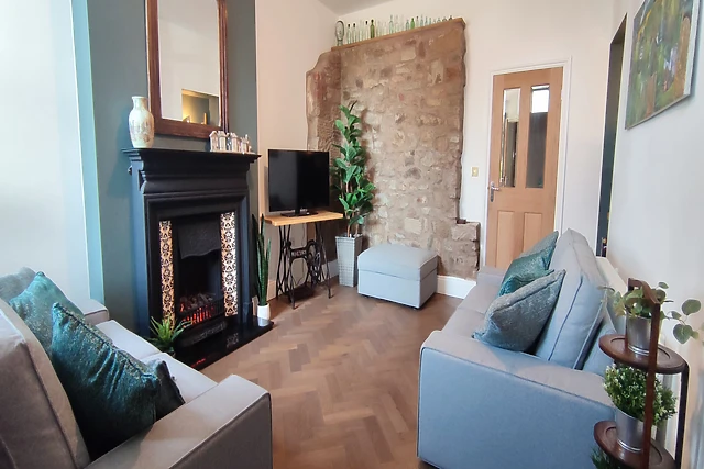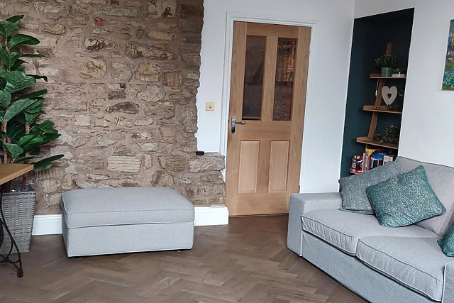 The inviting sitting room is adorned with a Smart TV and an electric fire, perfect for those chilly evenings. Draw your attention to the room's unique stone-built wall, originally part of a safe used by the council in its previous life.