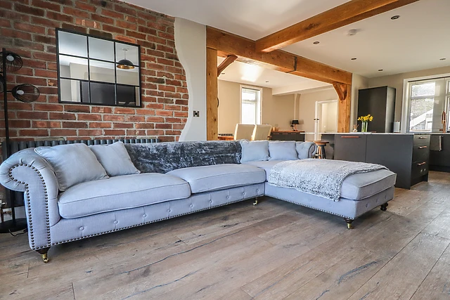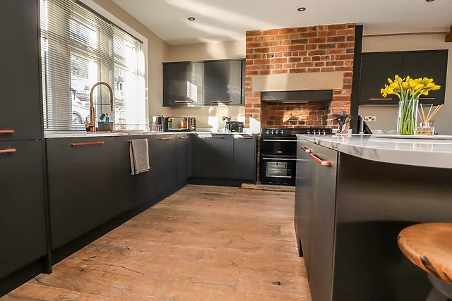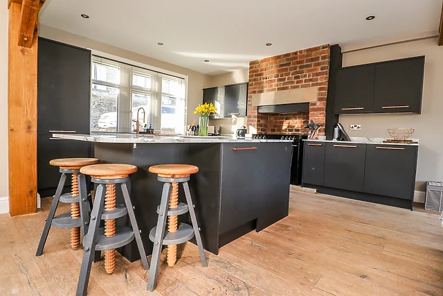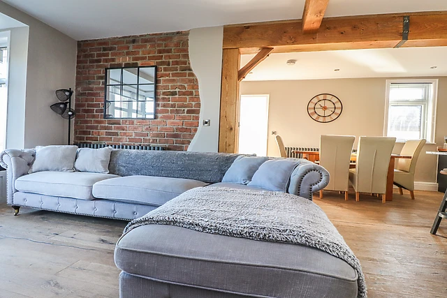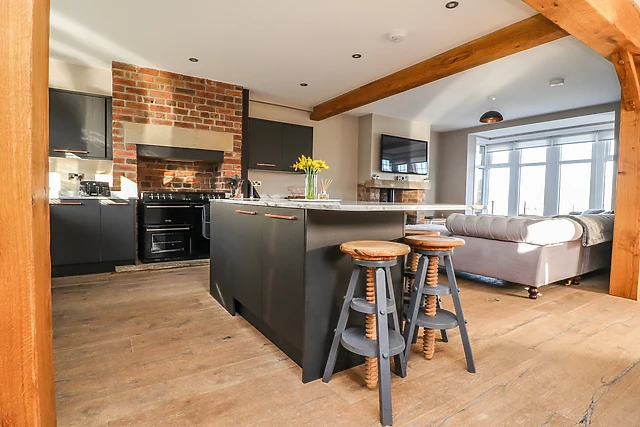 The open-plan living space, complete with a woodburning stove, provides a warm and inviting atmosphere for relaxation and socialising. The modern kitchen is equipped with high-end appliances, perfect for culinary enthusiasts.