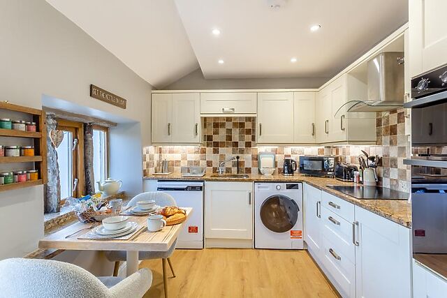Enter the holiday retreat into the inviting lounge, where you’ll find an array of comfortable seating arranged around a cosy wood burner – perfect for warming your toes after a long, countryside ramble. Moving through to the kitchen, you’ll discover everything needed to whip up hearty meals.