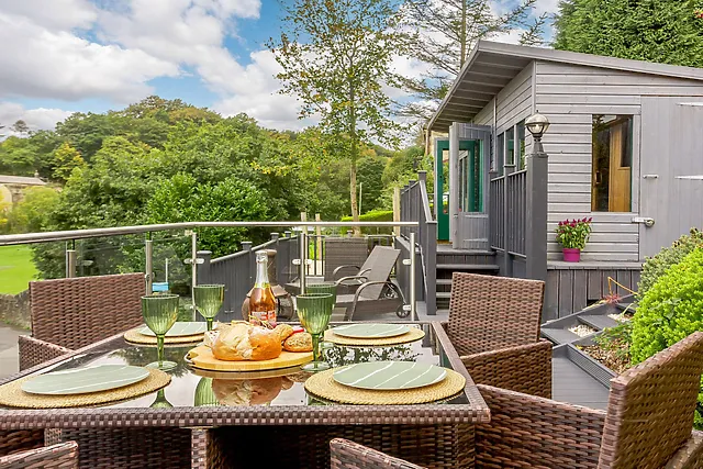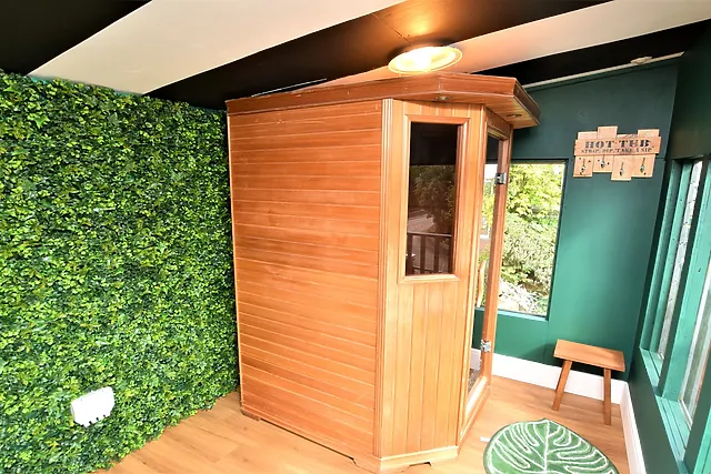 Step outside to the decking area where you can lounge amidst the trees or enjoy the lower tier with its cosy seating and bar table. The highlight of your stay will undoubtedly be the indulgent hot tub and sauna housed in a summer house, providing a serene sanctuary to unwind in any weather.