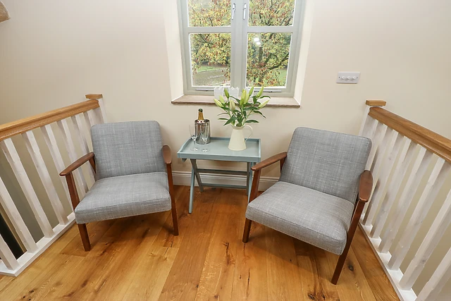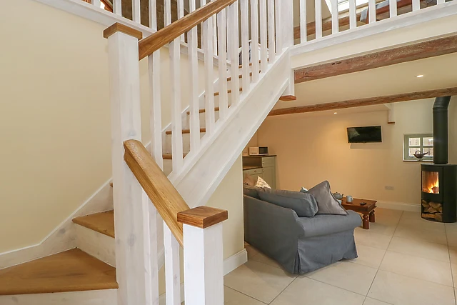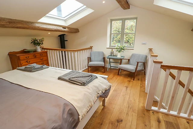 Elegance oozes throughout this holiday home, with an open-plan living area boasting a charming woodburner and contemporary colour schemes. Upstairs, under the open eaves, is the spacious bedroom enhanced by an exposed stone wall and Velux windows flooding the interior with natural light.