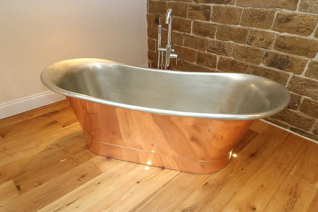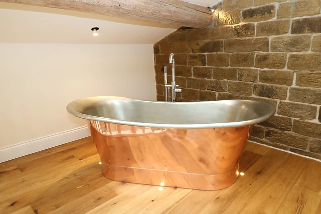 A copper, freestanding bath rests in the corner for a stylish effect. Wake up to the sounds of wildlife outside the window after a peaceful night's rest and refresh under the shower each morning in the ground floor wet room.