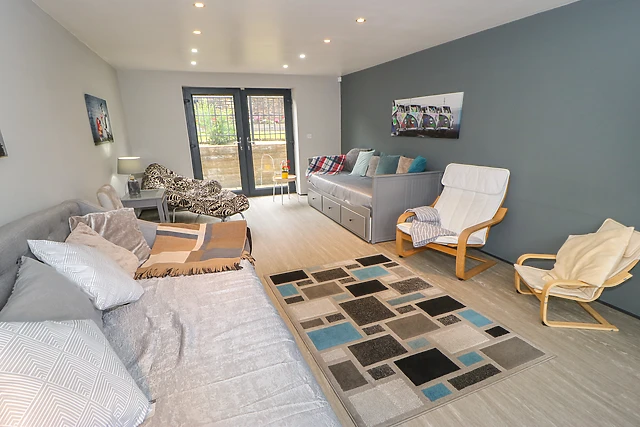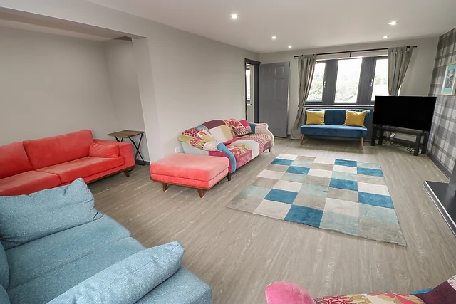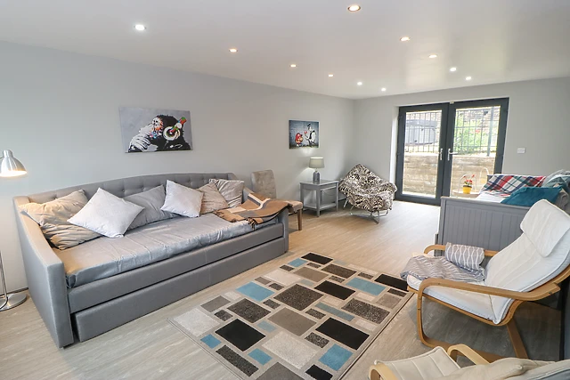 The ground-floor sitting room includes sofas that can sleep up to four extra guests, providing flexible sleeping options for larger groups.