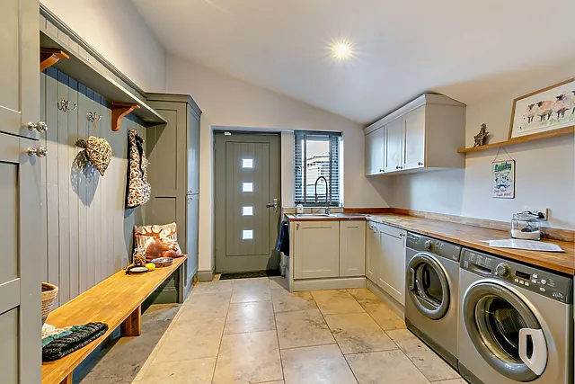 The well-equipped kitchen includes an electric oven and hob, fridge/freezer, washing machine, tumble dryer, microwave, and dishwasher, catering to all your culinary needs.