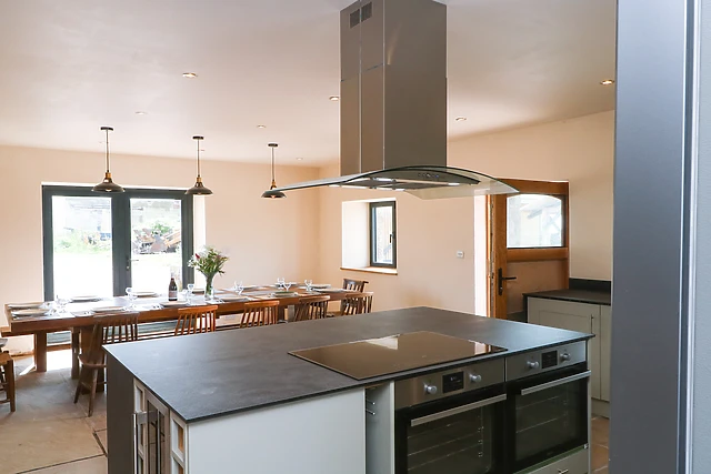 Floor to ceiling windows also frame pleasant views across the countryside, whilst the exposed brick walls retain the original character of the barn, making for a perfect spot to curl up with a good book even on rainy days. Head into the large, spectacular kitchen/diner with all the modern-day comforts needed for a self-catering stay, including an electric double oven, induction hob, fridge/freezer and dishwasher, ideal for the group's chef to rustle up delicious home-cooked meals.