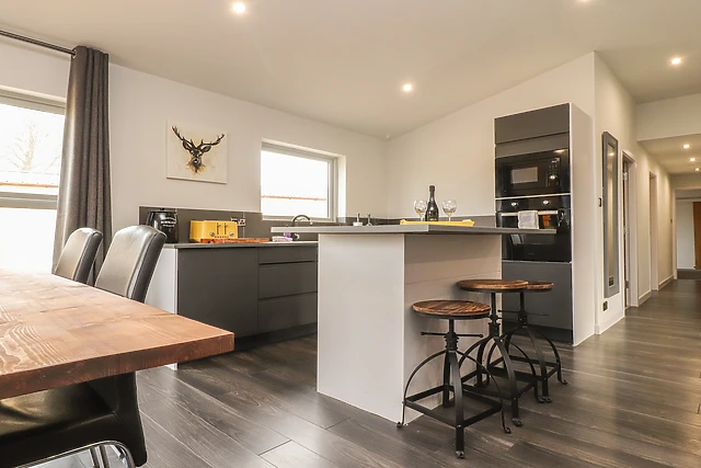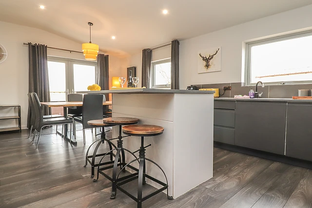 Indulge in the modern open-plan living space, boasting a fully-equipped kitchen and a bespoke dining area, ideal for social gatherings.