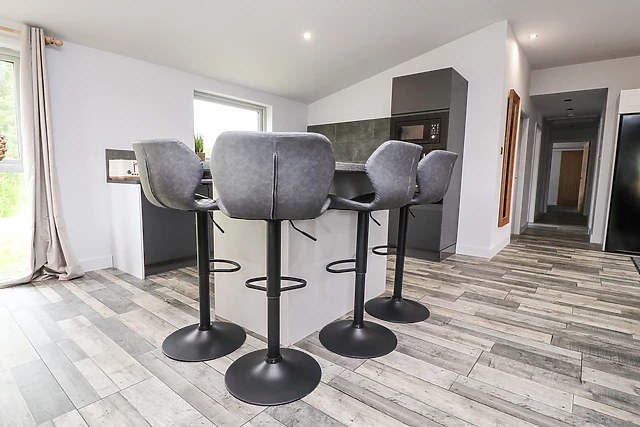 The cottage's open-plan living space is a testament to modern living, with a well-equipped kitchen and a vast sitting area with a Smart TV for entertainment.