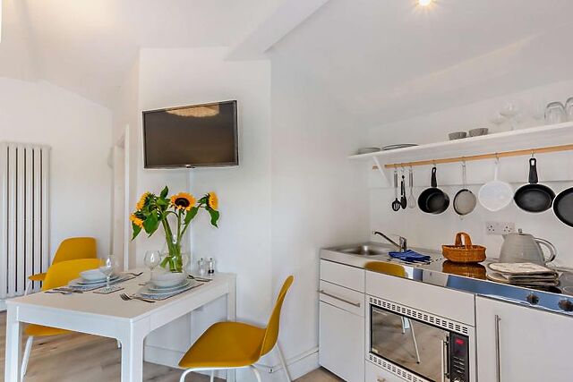 Living space - Open-plan living space with lounge area featuring a Smart TV. - Stylish kitchen with central island, plus dining areas for intimate meals.