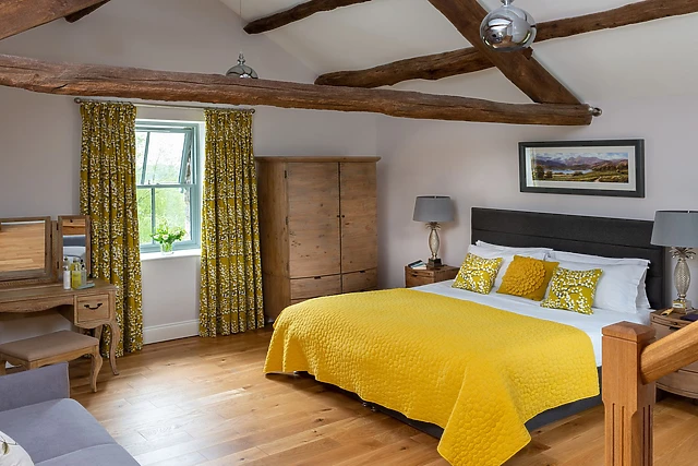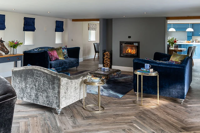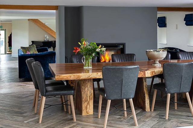 The main living room is furnished to a very high standard with beautiful tiling and underfloor heating, a modern double sided wood burning stove as the main focal point of the room, a piano to enjoy a family sing along and patio doors with far reaching views of the surrounding countryside. Continuing through the room the main dining area contains an Indonesian wood table, ideal for sitting down and enjoying a special meal with the group.