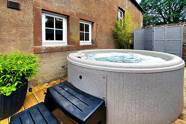 The elegant bathroom features a luxurious freestanding bath, a separate walk-in shower, and a WC. Step outside to find a private decked area with a bubbling hot tub and outdoor furniture, perfect for soaking under the stars.