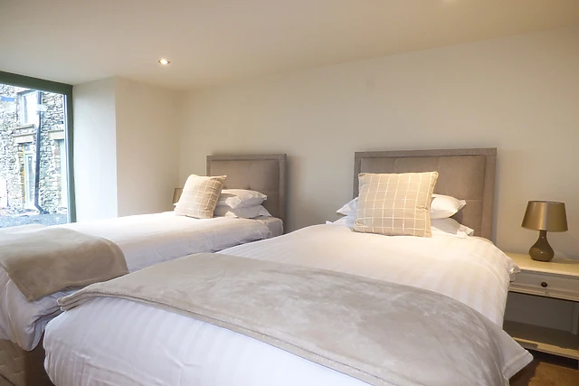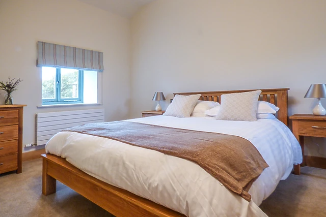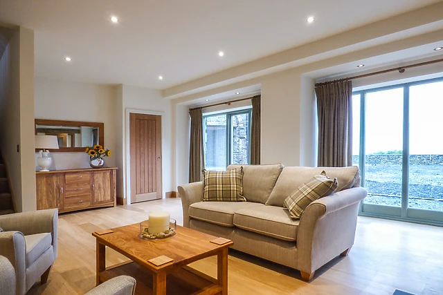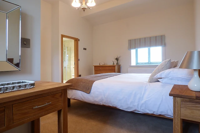 This stone, terraced, cottage directly overlooks the courtyard to the long range views. Stepping into this cottage there is a spacious bedroom on the ground floor with large windows and en-suite with shower, large contemporary basin and WC.