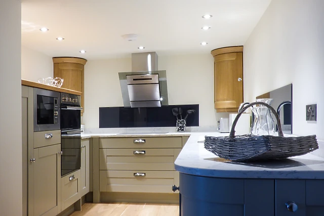 Enter the luminous open plan living area incorporating the sitting room and dining area with its large glass windows providing views over the surrounding hills. The bespoke kitchen has crystal door handles on wooden curved cupboards above the coloured base units with stone work surfaces.