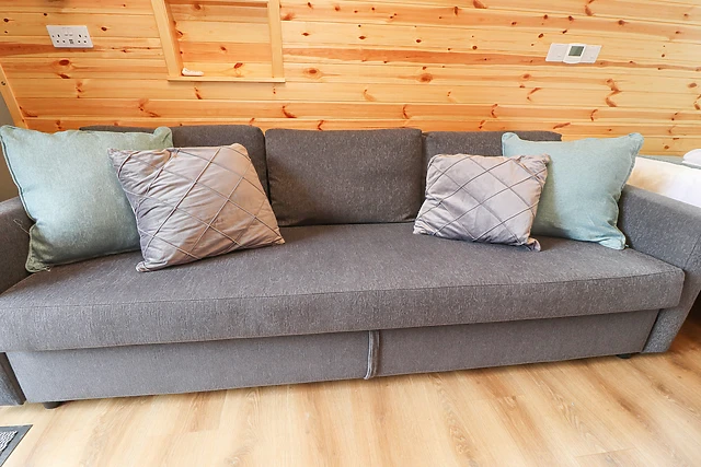 The open-plan living space is beautifully appointed with a well-equipped kitchen, dining area, and a plush sofa to unwind on while watching your favourite film on the Freeview TV.
