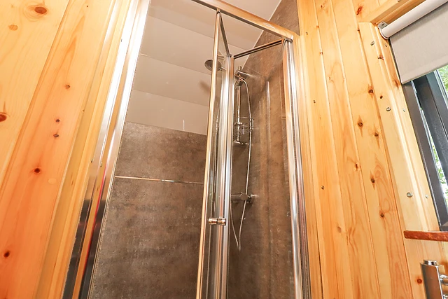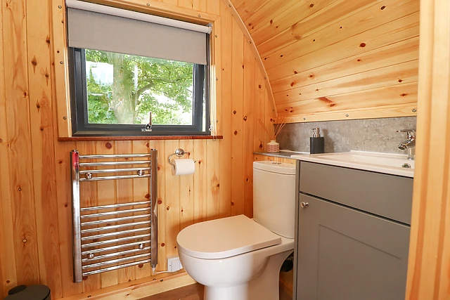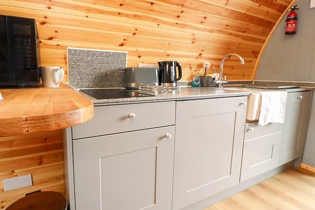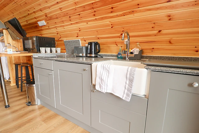 The pod is equipped with a modern kitchen featuring an induction hob, combi microwave/oven, fridge/freezer, and dishwasher for all your culinary needs.