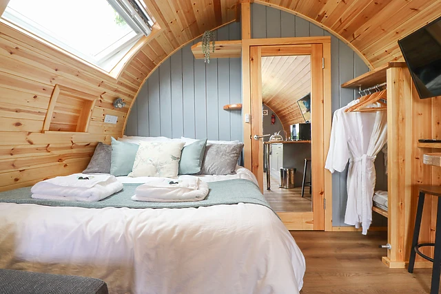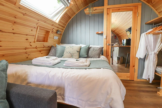 The pod sleeps two guests in a sumptuous double bed, ensuring a cosy and intimate setting.