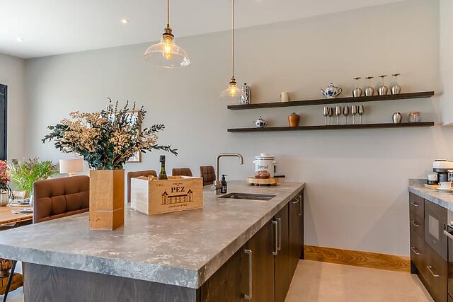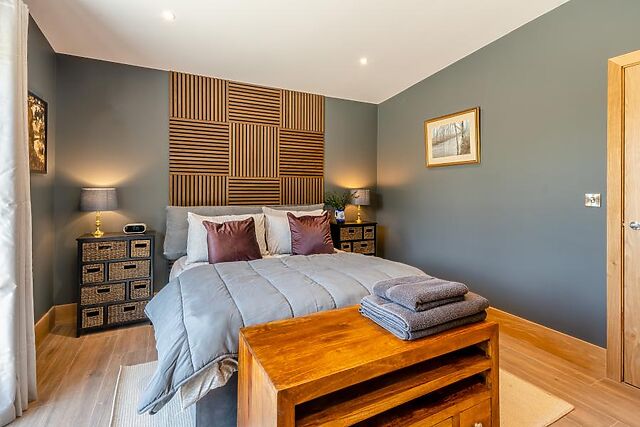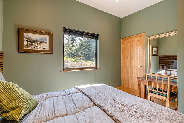 From here, you’ll be drawn into the showstopping open-plan lounge, kitchen, and dining area, where floor-to-ceiling windows and sliding doors frame the spectacular countryside views. Relax in the cosy lounge, complete with plush seating and a Smart TV, or gather around the dining table for memorable meals.