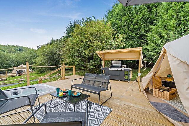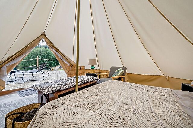 Step up onto your private deck and inside the secluded, safari-style tent. Inside, you’ll find a restful double bed and comfy seating perfect for kicking back in after days of outdoor adventures.