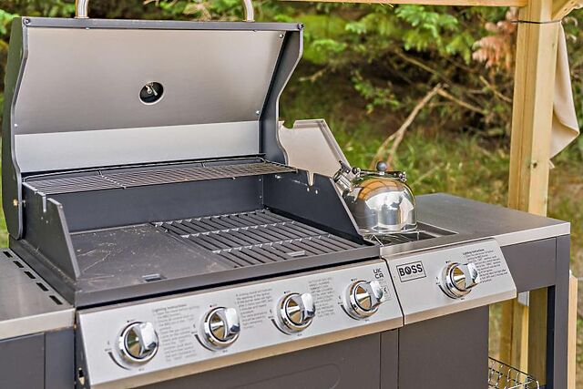 When it comes to cooking with the local produce sourced on your travels, step back out to the decking to find a covered, open-air kitchen with a gas BBQ and hob, and a sink. Enjoy the chosen chef’s work at the outdoor dining table.
