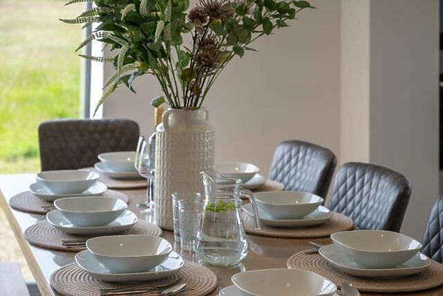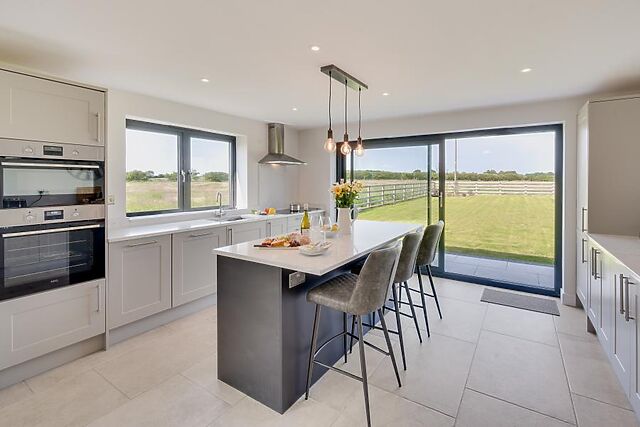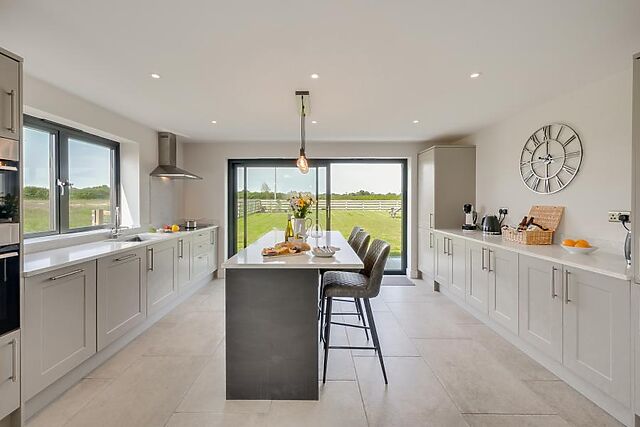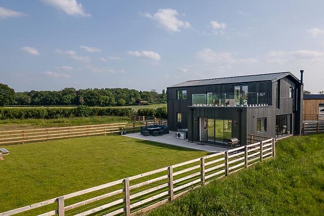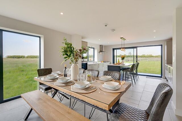 These share a chic family bathroom with a freestanding bath and a separate shower. Gather at the outdoor dining area alongside the enclosed garden lawn and dine alfresco as the sun sets over the fields.