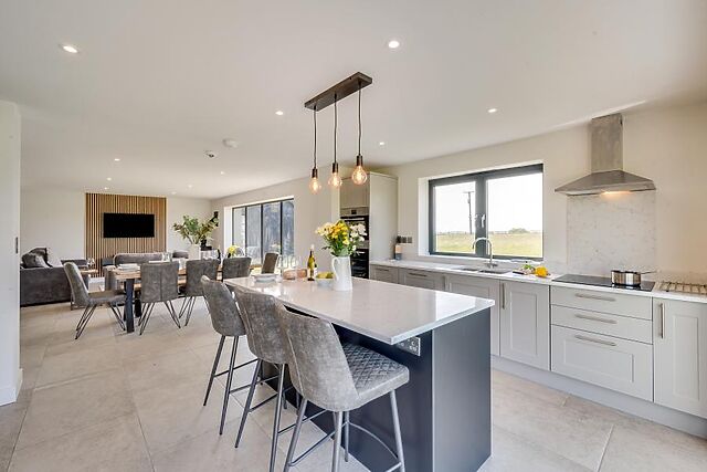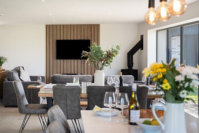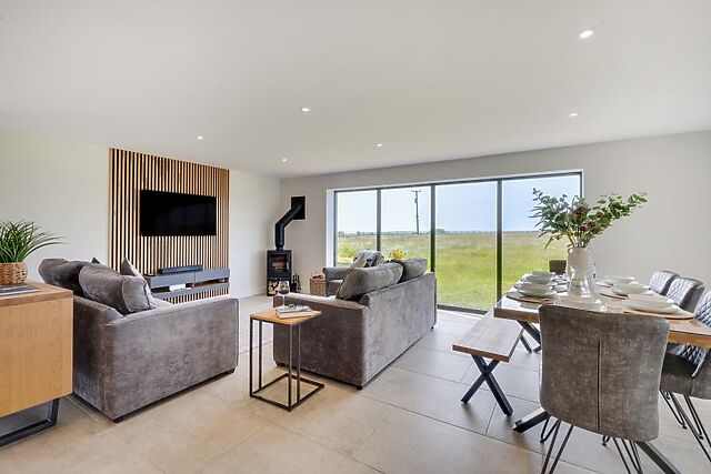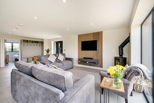 The inviting seating area is centred around a cosy wood burner for relaxing with a book or enjoying a film on the Smart TV. The well-equipped kitchen features Shaker-style cupboards, modern appliances, and a coffee machine.