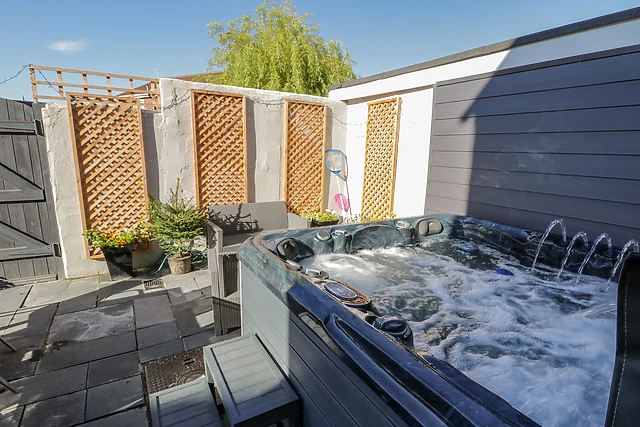 The property boasts an enclosed rear patio garden, providing a secure and private outdoor area to enjoy, complete with hot tub and furniture.