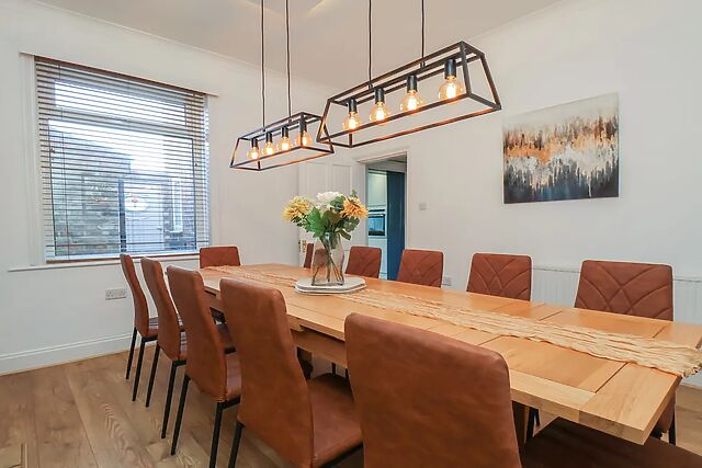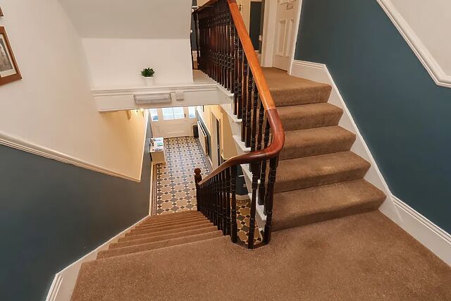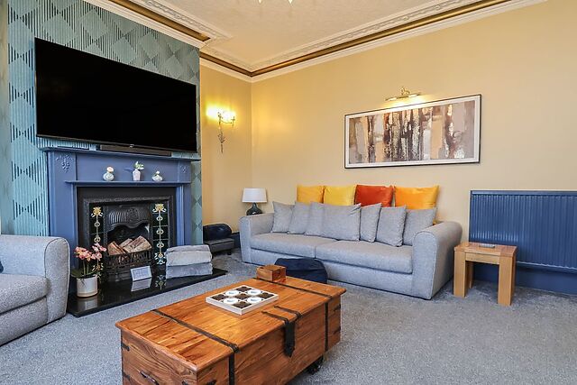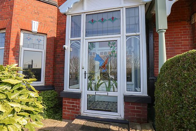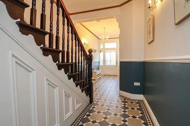 Inside, the house retains all the warmth and grandeur of its heritage, with high ceilings, ornate coving, mosaic-tiled floors, and stained-glass details. The welcoming hallway leads into two elegant reception rooms, a bay-fronted lounge with a feature fireplace and picture windows framing countryside and sea views, and a charming dining room with another original fireplace, ideal for family meals and long conversations after a day by the coast.