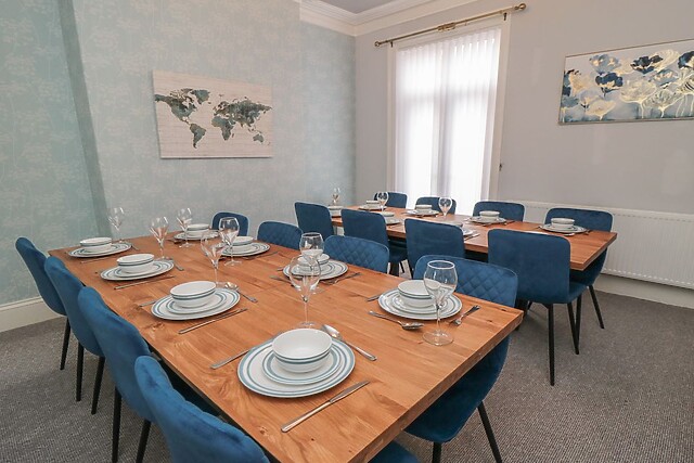 Upon entering the property, you'll be greeted by a spacious kitchen/diner, fully equipped to cater to your culinary needs throughout your stay with the added comfort of a TV and woodburning stove to set a warm atmosphere. Adjacent to this, you'll find a grand dining room, boasting seating for up to 16 people, perfect for hosting memorable meals with your loved ones.
