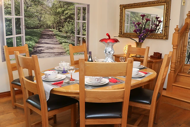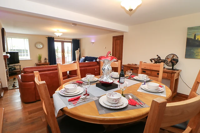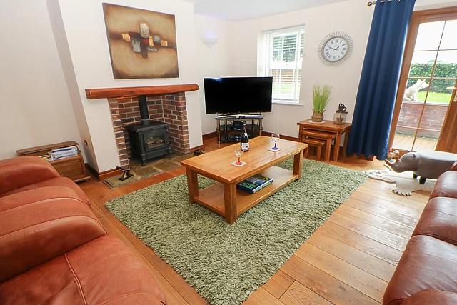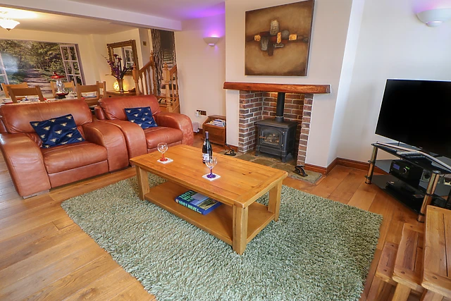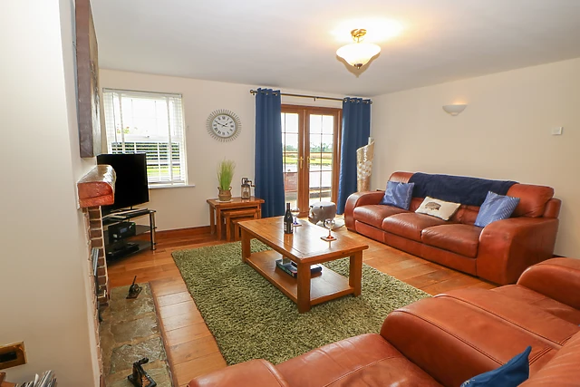 The sitting room includes a dining area with a modern leather suite and gas stove. French doors lead to the outside area where you will find the hot tub, ideally located in a private gazebo and enjoys lovely views across the adjoining meadowland, a great place to relax and chat about your plans for the next day’s adventures.