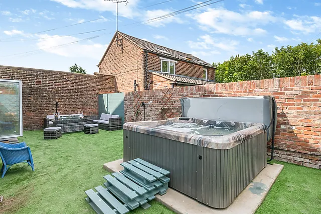 Yes, the property features an 8-seater hot tub in the enclosed garden patio area, perfect for guests to unwind and enjoy some relaxation time.