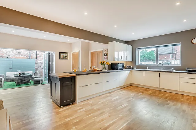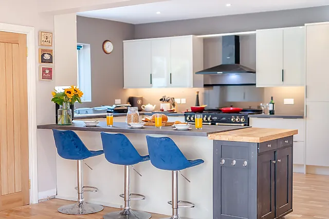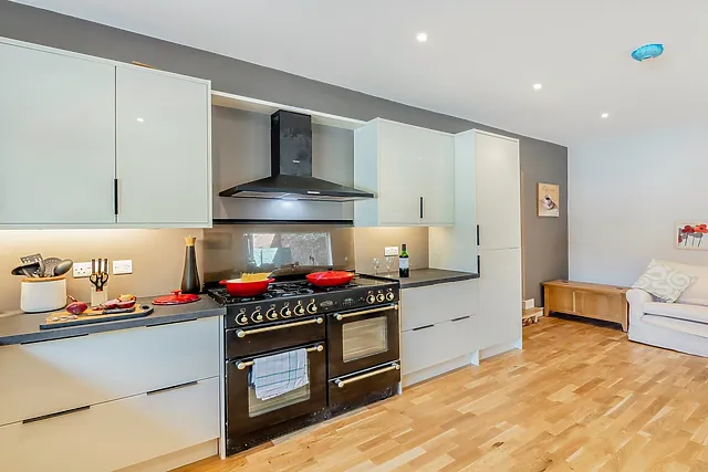 Indulge in the warmth of the wood burner in the open-plan living area, or gather around the impressive dining table for a family meal. The kitchen is equipped with a range oven and a breakfast bar, ideal for social cooking or casual dining.