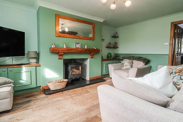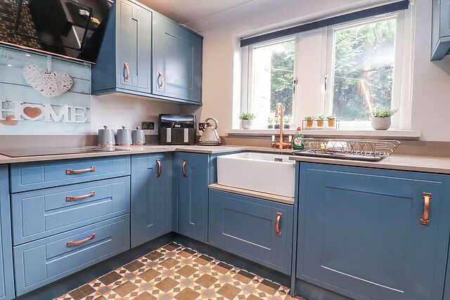With stylish blue kitchen furniture with copper handles and a Belfast sink, the kitchen/diner is a simply stunning place to cook and dine together using local produce. From here, discover a sitting area to the rear of the property where you can enjoy breakfast outside, or as the sun sets overhead, take an indulgent dip in the bubbling hot tub.