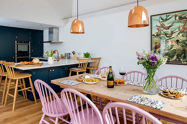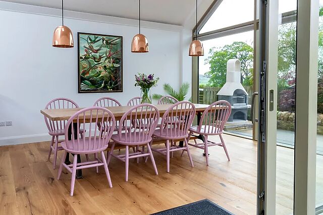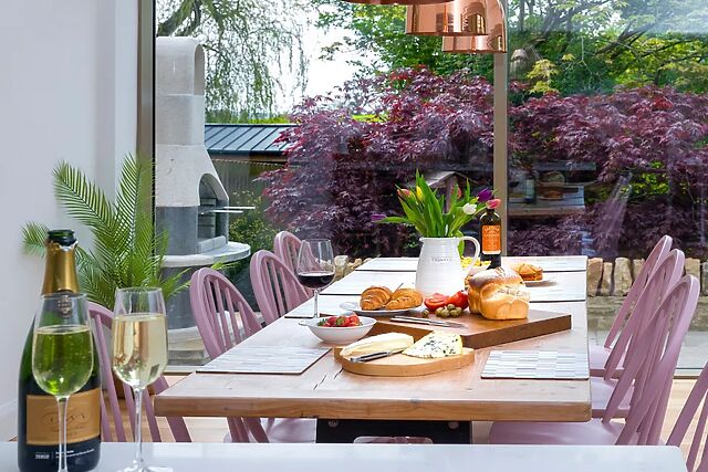 Benefit from three off-road parking spaces, before heading through the quirky pink door of the home with your personal belongings in tow. Be welcomed into the stylish open-plan living space with a fully-equipped kitchen with state-of-the-art appliances, a sleek breakfast bar, a lofty dining table, plush seating, a Smart TV, and a woodburning stove; the space also enjoys direct views out to the kitchen, making it the perfect place to dine, socialise, and make memories.