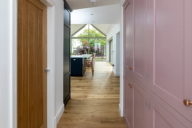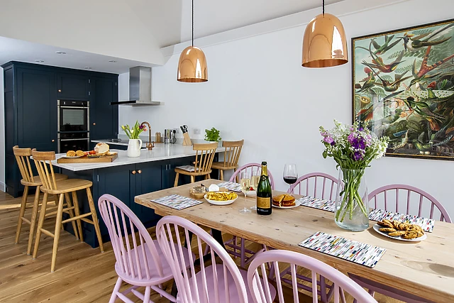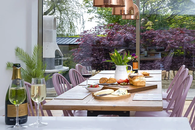 Benefit from three off-road parking spaces, before heading through the quirky pink door of the home with your personal belongings in tow. Be welcomed into the stylish open-plan living space with a fully-equipped kitchen with state-of-the-art appliances, a sleek breakfast bar, a lofty dining table, plush seating, a Smart TV, and a woodburning stove; the space also enjoys direct views out to the kitchen, making it the perfect place to dine, socialise, and make memories.